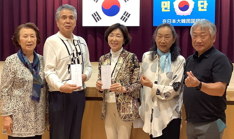 参加者は昨年を上回る164人。優勝は昨年同様、男子の部が金富夫さん(468点、名南支部)、女子の部は婦人会愛知本部会長でもある裵福蘭さん(401点、名南支部)。同本部の徐美也子副会長が1日、民団愛知本部で副賞の商品券を手渡した。