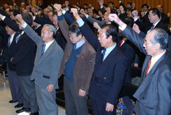 参加者は▽北韓が核開発を即刻中止することを要求し、真の南北交流を通じた韓半島の平和定着のため積極的に努力する▽同胞社会の和合と統一のために総連同胞との交流を積極的に推進する▽同胞社会の確固たる経済基盤の構築のために民族金融機関を積極的に支援していく▽地域住民として共生社会を実現するため地方参政権獲得に全力をつくすとの決議文を満場一致で採択した。