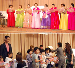 [ 式典でハーモニーを奏でた婦人会北海道本部のコーラス(上)。オリニにもプレゼントが贈られた ]
