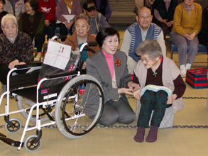 【栃木】婦人会栃木県本部(崔龍珠会長)は11月27日、宇都宮市内の養護老人ホームちとせ寮を訪れ、入所者と交流した。「ちとせ寮」慰問は金春枝前会長当時から毎年欠かさず続けており、今年で10年目。10年の「区切り」にと、交流会の席で車いす3台を寄贈した。