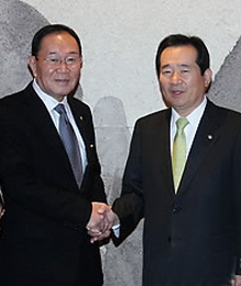[ 鄭進団長と握手する丁世均民主党代表 ]