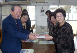 [ 愛神愛隣舎に義捐金を手渡す白永煕民団兵庫団長(左)と婦人会兵庫の役員たち ]
