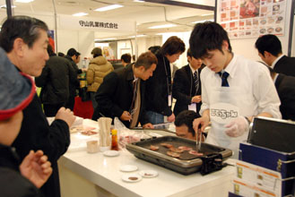 食肉・食材コーナーでは、黒毛和牛といった国産ブランド牛肉が勢揃いする一方、豪州や米国の食肉事業団も出展し、来場者に試食させながら懸命の売り込み合戦を繰り広げる活気を見せた。