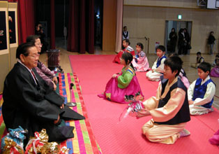 【大阪】ソルラル(旧正月)を前にした23日、金剛学園小学校で「民俗の日」行事が行われた。児童190人は全員、韓服で正装し、体育館で待つ韓校長や金理事長らに代わる代わる新年のあいさつ(歳拝)を行った。