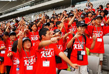 [ ソウルW杯スタジアムで「テーハンミング」と叫ぶ第2回オリニ・ソウルジャンボリー参加者(昨年8月) ]