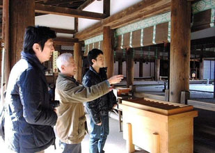 [ 春日大社でガイドを務める池田会長(中央) ]