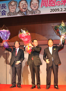 [ 大会後の祝賀会で花束を手にする新三機関長(左から黄迎満議長、鄭進団長、金昌植監察委員長) ]