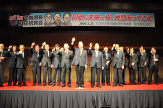 第51回定期大会(23日)の終了後、都内のホテルを会場に新3機関長就任祝賀会が中央本部の主催で開かれ、中央委員・代議員をはじめ全国の幹部ら約400人は、ステージ正面に掲げられた「同胞の未来は強い民団あってこそ」のスローガンにふさわしく、お互いに励まし合っては、組織強化に取り組み、今後の困難に立ち向かう決意を確認しあった。