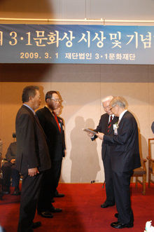 [ 3・1文化賞特別賞を授与される民団中央本部3機関長(左側) ]