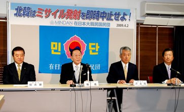 私たち在日韓国人を代表する韓国民団は、この北韓の一連の行為に対し、同族として到底理解することが出来ないばかりか、怒りすら覚えます。韓国をはじめ、中国、ロシアの周辺国も自制を求める声明を発表しております。私たちは、北韓の準公館的役割を担っている朝鮮総連に、韓半島と東アジアの平和を願い、在日同胞の生活と安全を守る立場から、北韓に対しミサイル発射計画の即時撤回を働きかけるよう断固要求いたします。