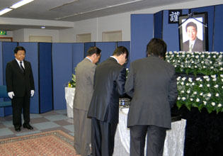 [ 大使館内に設けられた弔問所で焼香する民団関係者。左端は権哲賢大使(25日) ]