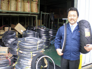 練りゴムと鋼線を組み合わせたビードワイヤー(タイヤの外端部)、繊維を組み合わせたタイヤコード(タイヤの裏側)、ゴムを組み合わせたトレッドゴム(タイヤの表面)、この3過程を経て成型(型に流し込む)し、加硫(焼く)して出来上がった製品を綿密に検査、出荷までの複雑な工程を一貫生産で行う。