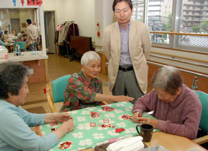 お仕着せのプログラムはなく、各自が自由に過ごせるのも特色の一つ。いちばんの人気は花札。点数に合わせてポーカー用のチップが行き交うのを見ていた職員は「計算が速い」と舌を巻いていた。認知症の予防にもよさそうだ。