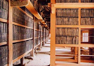 海印寺蔵経板殿(95年登録)。慶尚南道陜川郡伽 面にあり、802年僧の順応と理貞によって創建された韓国3大寺刹の一つ。仏教の経・律・論の三蔵を集大成した8万枚におよぶ大蔵経板が保存されている。
