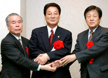 [ <新三機関長> 再選を果たした金宰淑団長(中央)と姜永祐議長(右)、左は金広昇監察委員長 ]
