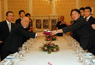 [ 現職の金宗洙会長に活動支援金300万円を贈る兪在根さん(左) ]