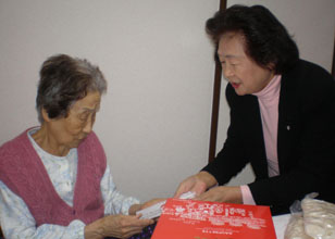 1月23日には余玉善中央会長らが、婦人会中央本部の初代会長を務めた呉基文顧問(98)宅(調布市内)を訪ねた。また、2月3日には余会長が、大阪の順姫顧問(94、元中央本部会長)宅を訪ね、記念品とトックなどを手渡した=写真。