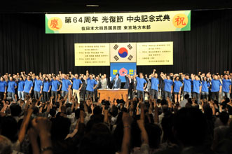 第64周年光復節慶祝中央記念式典が15日、民団東京本部の主管により東京・日比谷公会堂で団員ら2500人が参加して開かれた。参加者は、①地方参政権獲得のために総力を結集する②韓半島の平和定着のため北韓に対して核兵器撤廃を促す③次世代育成と民族文化振興に尽力する④同胞社会の経済発展のために全力を尽くす⑤韓日友好親善と共同繁栄に積極貢献する−−ことを再確認した。また第2部として「地方参政権早期獲得決起大会」を開き、目前に迫った8・30衆議院総選挙での地方参政権付与賛同候補者への最大限の支援などを決議した。この日、全国各地の民団で開かれた光復節慶祝記念式典でも同様な決議が行われた。