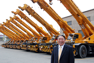 会社の敷地に入ると、クレーンもトレーラーも、同じ向きに整然と並ぶのが目につく。「当社は整理整頓のモデル企業。清掃はもちろん、クレーンの並び方はどれも同じ角度だ」と強調する。国土交通大臣から表彰され、大阪地区のクレーン建設業協会の理事長を務める。読書が趣味で、出世物語を好んで読み、経営の参考にしたという。