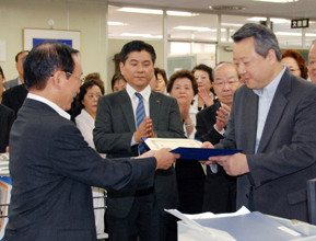 [ 李時香団長(左)から委嘱状を受ける崔聖植さん ]
