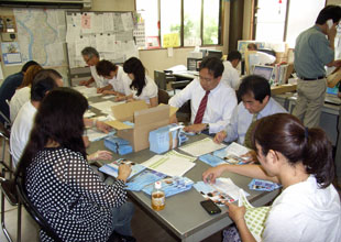 団員も支持候補の事務所で法定ビラへの証紙貼りなど各種作業を手伝った ]