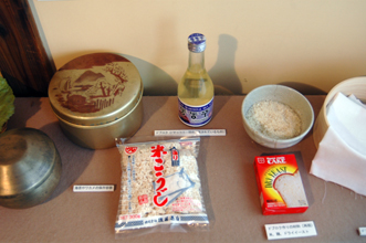 食生活ではキムチを漬けた甕や60〜70年代に実際に使われた焼肉用ロースター、唐辛子やニンニクやゴマなどをすりつぶした道具が、当時の食生活の一端を物語る。実物の米こうじと米、イースト菌の3点を並べ「どぶろく」の作り方も紹介している。