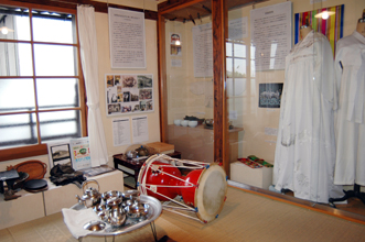 会場は同博物館2階、4畳半のスペース。異国で厳しい差別のなか、民族的アイデンティティーを大切にしてたくましく生き抜いてきたことを、大小の説明パネルと多彩な生活用具で知らせている。企画展のために収集した資料は約200点に及ぶ。