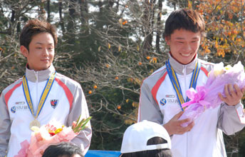 [ <ゴルフ>在日同胞男子は個人戦で河尊永(右)が優勝し、団体でも金龍大(左)とともに金メダルを獲得した(22日) ]