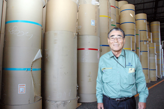 ダンボールの素材となる原紙を製造する。最も軽量の「内装ライナー」を手掛け、工場内には円柱形のライナーが所狭しと並ぶ。