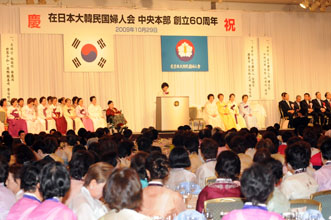 在日本大韓民国婦人会中央本部創立60周年記念式典が10月29日、東京都内のホテルで全国各地の婦人会幹部ら1200人が参席して開かれた。参加者は、賢母の精神をさらに高め、紐帯強化、次世代の育成に全力を尽くすことなどを決議した。また、全同胞の懸案である地方参政権の早期実現へ継続尽力することを確認した。第2部の祝賀宴では、芸能公演などが行われた。