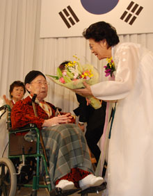 婦人会中央60周年式典に、初代会長の呉基文顧問(98)が車イスながら元気な姿で臨み、余玉善会長から感謝の花束を贈呈された。
