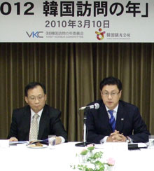[ 記者を前に説明をする「韓国訪問の年委員会」の盧永雨運営本部長(右)と韓国観光公社の金栄湖東京支社長 ]