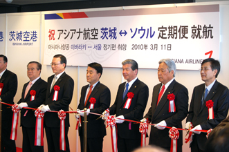【茨城】茨城空港(茨城県小美玉市)が11日開港し、アシアナ航空が新規就航した。空港では、アシアナの尹永斗社長や国土海洋部の崔政浩ソウル地方航空庁長、茨城県の橋本昌知事、民団茨城県本部の金政雄団長らが出席し、テープカットを行った。