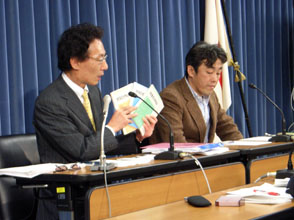 [ 会見するRENKの李英和代表(左)と高英起事務局長(文部科学省で) ]