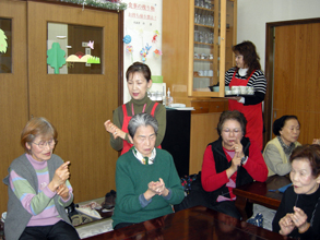 [ スタッフの指導のもと「指先運動」に励むお年寄りたち(民団八尾支部) ]