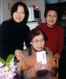 [ 60周年記念事業として婦人会功労高齢者(中央)を慰問する宮城県本部の役員(1月21日) ]