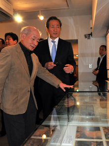 [ 在日韓人歴史資料館を視察するハンナラ党の鄭夢準代表(右) ]