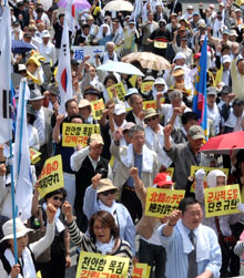 頭上高く上げた握り拳がわずかに震え、北韓の軍事挑発へのいいしれぬ怒りを表していた。その怒りは北の犯罪行為にだけではない。北韓の言い分をオウム返しに繰り返す総連当局にも向けられていた。この日、5日昼過ぎの最高気温は24・9度。韓半島の平和を願う行進隊は、したたる汗をぬぐいながら、最後までシュプレヒコールを叫び続けた。