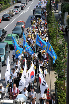 コースは芝公園から愛宕神社前、西新橋1丁目、新橋駅前、土橋を経由、終着点の日比谷公園までの約2・2㌔。4台の宣伝カーと4隊列からなる行進隊は、拡声器で「私たち在日韓国人は北朝鮮の軍事挑発行為に断固抗議する」と繰り返し訴え、「北韓のテロ絶対に許さぬ」「韓半島の平和守れ」「総連は目を覚ませ」「金正日を断罪せよ」とハングル、日本語で書かれた横幕やカードを掲げて、シュプレヒコールを繰り返した。行進は約1時間30分にわたって力強く、整然と展開された。