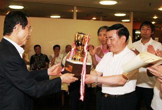 [ 団体優勝の東京団長杯を手にする台東支部の夫奉秋支団長 ]