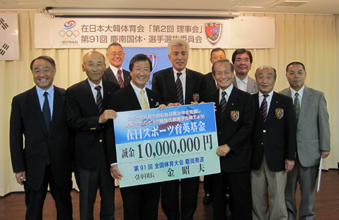 この日、今国体で在日同胞選手団引率団長を務める金昭夫民団中央副団長から、「スポーツを通じた次世代育成事業をより活性化させるべきだ」との提案があり、「その一助にして欲しい」と1000万円が朴会長に伝達された。
