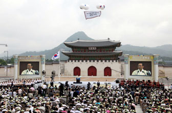 私たちはこの席に再びそびえ立った光化門を仰いでいます。栄辱をともにした民族史100年が走馬燈のごとく過ぎ去ります。万感が去来します。感慨無量です。