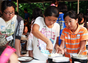 期間中、オリニたちは紅白対抗の運動会やイカダレース、キャンプファイヤーなどを楽しんだ。世話役のリーダーとも仲良しになり、元気な歓声をあげていた。2日目の夕食では飯ごう炊きとカレーライスづくりに挑戦、友人と一緒になって共同作業を体験した。