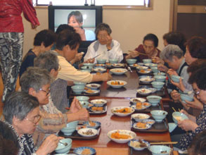 [ 婦人会オモニの手料理に舌鼓をうつ1世のお年寄りたち ]