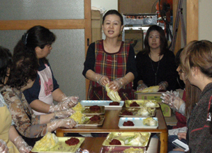 [ 成田商店の朱孝子さん(正面)がキムチづくりを指導 ]