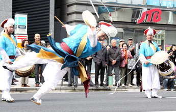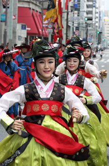 朝鮮通信使が出演したのは08年についで2回目。この日は、釜山の(社)朝鮮通信使文化事業会のメンバー約50人に民団東京管内各支部の役員や団員約100人が加わり、正使の輿行列にサムルノリや、楽隊が連なって沿道の人々を魅了した。