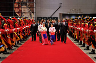 続いて、演慶堂では韓服デザイナー李ヨンヒさんによる韓服ファッションショーが行われ、朝鮮王朝の宮中衣装や一般韓服、金・銀箔を施したチョゴリ(上衣)など、多彩な韓服を紹介。各国首脳夫人らはカラフルで鮮やかな韓国の美を堪能した。