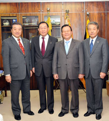 朴世逸・韓半島先進化財団理事長(ソウル大学国際大学院教授)は1日、東京・港区の民団中央本部を訪問し鄭進団長らと懇談した(右から2人目)。その後の記者懇談会(民団中央組織局主催)では「韓半島の先進化と統一問題」について講演した。