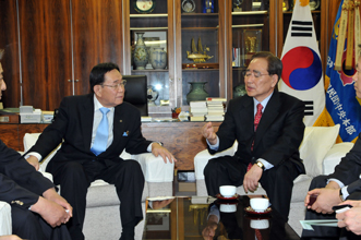 「在日同胞の崇高な創業精神に戻り、イチから出直したい」在日同胞株主との意見交換のため来日した新韓金融持株会社の韓東禹会長内定者(62)は2月23日、東京・港区の民団中央本部に鄭進団長を礼訪し、再出発に向けた決意について語った。