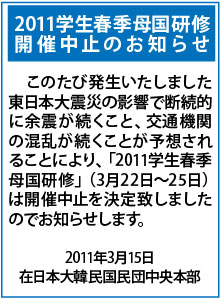 民団中央本部は15日、3月22日から3泊4日間、韓国ソウルで開催する予定だった「2011学生春季母国研修」を中止することを決定した。